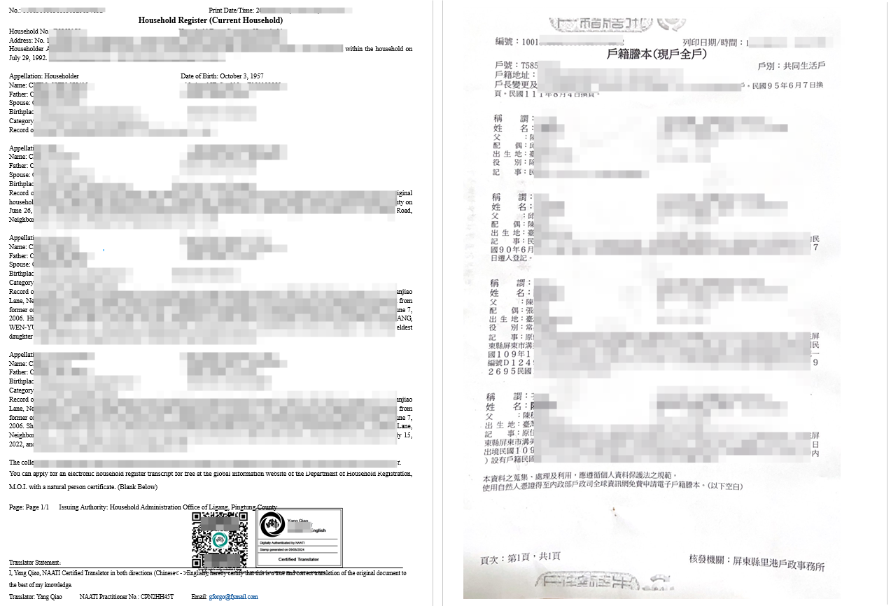 台灣戶口名簿或戶籍相關文件中,通常包含申請人的姓名、出生日期、親屬關係、婚姻狀況、戶籍地址、父母或配偶資訊等重要內容。這類文件不僅資訊量大,而且涉及身份關係和法律用途,因此翻譯時不能只是簡單直譯,而需要準確保留原文含義,並符合澳洲官方文件的表達習慣。例如「戶籍地址」「遷入日期」「父母姓名」「配偶關係」「身分證字號」等內容,都需要由熟悉台灣文件格式及澳洲遞交要求的譯員進行專業處理。